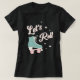 Camiseta de festa de aniversário de patinagem com rolo cúmulo, com "rolo de Vamos" em um roteiro divertido do estilo 70 e uma ilustração retrô-inspirada de um skate de rolo rosa azul e azul-esbranquiçado.