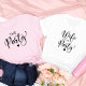 Camiseta de festa de solteira de esquadrão linda com "A festa" em um roteiro chico com coração. Você pode mudar a cor da camiseta. A camiseta "Esposa do Partido" está disponível para a noiva.