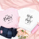 Camiseta de festa de solteira de esquadrão bonita com "A festa" em uma escrita de chico com coração e "Austin, TX" em uma simples tipografia moderna. Você pode mudar o destino da parte e a cor da t-shirt. A camiseta "Esposa do Partido" está disponível para a noiva.