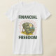 This tee let's you relax in abundance. This “Financial Freedom” woman's t-shirt features a stack of bills lounging on a beach chair under the sun, framed by bold “Financial” and “Freedom” text. A vibrant symbol of wealth, independence, and lifestyle goals.