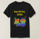 Esta design de camisa vibrante e divertida apresenta um padrão inspirado em fogos de artifício celebratórios coloridos, juntamente com o número "43", tendo um espectro de inspiração multicolorido no arco-íris ou padrão de gradiente. Ele também apresenta um nome personalizado e uma mensagem de evento, como uma saudação de aniversário de "Parabéns". Uma camisa como esta pode ser vestida pelos participantes numa festa de aniversário que se realiza em comemoração dos quarenta e três anos de alguém. [~Z0000332]