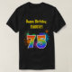 Esta design de camisa vibrante e divertida apresenta um padrão colorido inspirado em fogos de artifício comemorativos que explodem, juntamente com o número "75", tendo um espectro de inspiração multicolorido no arco-íris ou um padrão de gradiente. Ele também apresenta um nome personalizado e uma mensagem de evento, como uma saudação de aniversário de "Parabéns". Uma camisa como esta pode ser vestida pelos participantes numa festa de aniversário que se realiza em comemoração dos setenta e cinco anos de alguém. [~Z0000332]