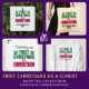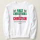 Stylish FIRST CHRISTMAS AS A CHRISTIAN New Believer Christmas Sweatshirt with CUSTOMIZABLE TEXT & DATE. Design shows Christmas green and Christmas red bold sans serif typography with red and green holly elements. A great festive 'ugly Christmas sweatshirt' to send to your family, friends, neighbors and coworkers who are new Christians and for whom this is their first 'new normal'. Ideal cozy apparel gift for new believers celebrating their first Christian Christmas. Kids' version and matching gifts available.