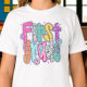 She’s officially a First Grader—and that calls for a fabulous first day outfit! This preppy and playful shirt spells out FIRST GRADE in bold, colorful letters, each with its own unique pattern (think leopard, stars, polka dots), plus happy smiley faces and a pop of lightning bolt flair. It's a mix of coquette cuteness and big girl confidence, perfect for celebrating this exciting milestone.