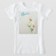 : A camiseta apresenta um design simples e elegante com um gráfico floral. O gráfico consiste de uma flor estilizada com duas flores, uma maior que a outra, conectada por um caule verde fino com folhas. A paleta de cores é macia, apresentando tons pastéis de laranja, preto e verde. Acima da flor, a palavra "Flor" é escrita em escrita cursiva com matiz azul que adiciona à delicada estética do design. O fundo é branco claro, que acentua o minimalismo e a sofisticação da imagem.