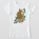 Um coelho marrom giro se senta entre flores cor-de-rosa contra um pano de fundo azul claro