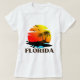 Um design retrô ilustrando o estado da Flórida, com uma silhueta central de um jacaré deitado fora da água acima, é um belo pôr do sol com pássaros voando pela cena tropical