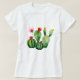 Red, pink, and yellow flowers bloom on some of the cacti and on a separate stem.