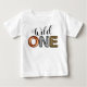 Camiseta de festa de 1º aniversário com a frase "selvagem" em diferentes impressões de animais. Você pode personalizar essa camiseta adicionando o nome da criança abaixo!