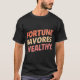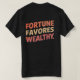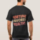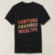 A design da t-shirt apresenta a frase "a fortuna favorece os ricos" numa letra elegante e vintage de máquina de escrever num fundo preto. O design é simples e atraente, sendo a frase o ponto focal.