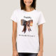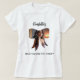 Uma camiseta branca de cor clara decorada com uma moldura de foto em forma de arco. Personalize e adicione um nome. Letra cursiva manuscrita preta.