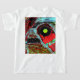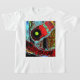 Wear bold creativity with this T-Shirt featuring Frequency Serpent. A serpentine red structure curves vertically across the fabric, marked by circular elements resembling vibrational cores, while horizontal bands of blue, green, and white flow in the background like waves of data. The interplay of intense colors and curved forms creates dynamic tension, transforming this everyday garment into a wearable canvas of digital abstract art. Perfect for casual wear, artistic expression, or gifting to those who love fashion with energy.