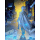 Frostmaker of a Moonlit Street – A Winter Portrait. Jack Frost strolls down a quiet winter street, painting the night with swirling frost and shimmering snowflakes. His animal friends follow close, watching as he turns the cold into magic. Warm lamplight glows behind him, making his icy trail sparkle. This charming scene captures the wonder of winter nights, inviting children to imagine a gentle spirit who plays while the world sleeps.