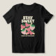 Design com o texto "Keep Sweet" em letras maiúsculas brancas e em negrito e arredondado no topo. Abaixo do texto, um padrão lúcido de morangos rosa estilizados com folhas verdes brilhantes e pequenas flores amarelas parecidas com margaridas.