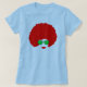 Uma mulher com um afro vermelho funky, com óculos de sol, e lábios vermelhos.