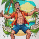 Bring tropical energy and good vibes wherever you go! This bold, cartoon-style design features a cheerful man in a vibrant shirt, enthusiastically hacking open a fresh green coconut on a sunny beach. With palm trees, turquoise ocean, and a bright sky in the background, this playful illustration captures the essence of summer fun and island life.