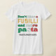 Fusilli Pasta Divertida NÃO FOGA UM T-Shirt italiano FUSILLI, projetado com a palavra FUSILLI feito de massas fusilli. O texto é criado nas cores da bandeira italiana - verde, branca e vermelha - e lê-se NÃO BLOW A FUSILLI COME MAIS PASTA. Você pode PERSONALIZAR o texto inferior adicionando seu nome ou outro texto divertido (ou excluir). Uma camiseta de macarrão engraçada e leve para dizer a todos o quanto você ama massa. Isso seria um presente excelente para eletricistas que amam massas, ou para acalmar amigos muito excitantes!