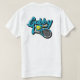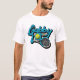 Uma fotografia cinematográfica, de alto contraste, apresenta um design de camiseta com tema de tênis. O nome "Gabby Love" é apresentado em uma fonte estilizada, com uma bola de tênis integrada a "Love" e a letra "G" criativamente criada a partir de uma raquete de tênis. O fundo azul gradiente evoca a sensação de um tênis, e a imagem global tem um encanto retrorreflector nostálgico.