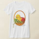 Uma design de páscoa muito bonita é esta de uma linda pintinho amarela sentada em uma cesta de ovos. Esta design fará você sorrir. É tão cheio de gentileza páscoa. Esta galinha e ovos na design de cesta parece excelente nesta t-shirt feminina. Perfeito para si mesmo ou como presente