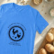 Camiseta azul brilhante com galo e design de galinhas. A imagem da silhueta preta de um galo, galinha e pintinho de um círculo é o design. Personalize o texto preto curvo e impresso no topo e adicione mais texto abaixo da imagem. O texto de exemplo é um nome de fazenda, com localização.