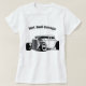 Ilustração da Garagem de Hot Rod, estilo Vintage, 1950s, com uma representação detalhada de um carro de haste quente. Perfeito para imprimir em roupas e acessórios com uma design de inspiração retrorreflectora.