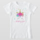 A camiseta desta menina apresenta um lindo monocórnio branco com flores, estrelas e brilho de ouro. Personalize as costas com a idade da aniversariante.