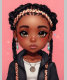Uma cativante modelo tridimensional de estilo chibi afro-americano com olhos grandes impressionantes, cílios longos e lábios carnudos. Ela está adornada com um casaco Louis Vuitton de comprimento total combinado com botas elegantes de cano alto. A arte captura o momento dinâmico enquanto ela graciosamente.