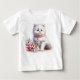 Uma camiseta fofa com um gatinho branco fofo com olhos azuis doces e um colar rosa. Um buquê de flores à sua volta. Diz 'Você é Purr-fect'