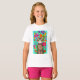 Camisa bonita do estilo da arte popular com um gato bonito. Esta arte é gerada por IA. Flores bonito, roxas e vermelhas, de fundo lacrimogêneo.