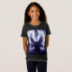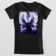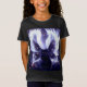 Camiseta com Innocence Fairy Cat, da vida selvagem e artista fantasiosa Michaeline McDonald, de um gato preto giro com asas roxas brilhantes contra um fundo estrelado preto.
