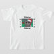 Um gato de Natal bonito vestindo um chapéu de Papai Noel vermelho e branco com ornamentos coloridos pendurados de um ouvido. Um fundo verde macio. As palavras "Meow" à volta da fronteira da design.