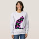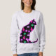 Camisola numa silhueta de gato sentado a preto, com um padrão de férias de ornamentos antigos de árvores de Natal em tons cor-de-rosa, verde e lavanda
