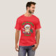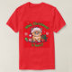 Design uma camiseta de Natal com um gato giro vestindo um chapéu de Papai Noel superdimensionado. O gato parece confuso e ligeiramente pateta, com uma expressão engraçada. Ao redor do gato estão enfeites de árvores de Natal espalhados, alguns bolinhos caídos, e uma pilha de presentes prestes a derrubar
