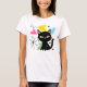 Ilustração colorida do estilo do Meio século abstrato com gato preto, estrelas pretas e formas geométricas coloridas decoradas sobre fundo branco