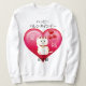Gato Sortudo, bonito e humorístico (Maneki Neko) com coração e balões para Dia de os namorados. Tradução japonesa: "Feliz dia de os namorados" no topo, "Maneki Neko" no fundo, "Amor" à esquerda e "Sorte" à direita no coração.