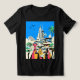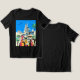 T-Shirt em ilustração de três na moda, gatos vestidos de turistas em frente a uma paisagem futurista. A arquitetura evoca estética de ficção científica do século médio. Os gatos possuem câmeras, mapas e pátios vistas, sugerindo aventura. Palmeiras e um céu azul brilhante melhoram a atmosfera de férias.