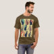 T-Shirt em nove gatos estilizados dispostos em um padrão de grade, cada um se posiciona contra diferentes colorido. Os gatos apresentam cores casaco e padrões variáveis, dando a cada um uma uma aparência única.