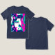 Tee em um design de inspiração moderna do século médio com dois gatos estilizados em formas ousadas e geométricas de turquesa, magenta, azul escuro e branco. padrões abstrato e formas retrorativas enchem o fundo, dando-lhe uma vibração divertida e vintage com uma borda minimalista.