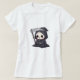 A soft, kawaii-style grim reaper sits quietly against a deep black background, wrapped in a flowing dark hooded cloak. The oversized round eyes, blushing cheeks, and tiny worried expression give the character an unexpectedly sweet and innocent mood. Cradled in its arms is a calm black cat, eyes closed in peaceful comfort, while a curved silver scythe rests gently at the side. Smooth shading, muted tones, and rounded shapes transform a traditionally dark figure into a tender, heartwarming illustration with a touch of quiet charm.
