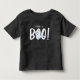 Camiseta de criança minimalista do Dia das Bruxas Negra com um fantasma azul-claro voando através do "boo!"
