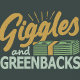 Duas palavras principais: "Giggles" escrito em uma fonte lúdica e leve, talvez com uma ligeira curva ou repulsa nas letras. "GREENBACKS" escrito em uma fonte ousada, possivelmente inspirada em dólar, com uma cor verde enfatizando a conexão com o dinheiro.
