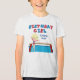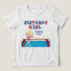 Esta camiseta de aniversariante da ginástica das garotas bonitinhas apresenta uma bonito moça loira na frente de uma viga. Ela está vestindo um leotard vermelho e sorrindo ao lado de seu lindo monograma azul. Adição perfeita a uma festa num ginásio.