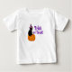 Vestir a sua menina/criança para festas de Halloween neste truque de querido ou tratar camiseta. Esta árvore apresenta um texto de aparência brilhante em roxo com uma lanterna Jack O' e um gatinho preto. Tão fofo quando vestido com pontas listradas laranja e preta do Halloween.
