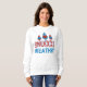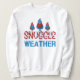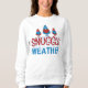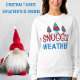 Gnomos lindos, Senhoras Divertidas, Sweatshirt desenhada com três gnomos roxos, vermelhos e azuis, de fundo branco. O texto é desenhado em vermelho vivo e azul, com neve e trim e inclui: tempo de proteção! Faz um presente de Natal excelente.