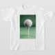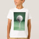 Uma bola de golfe branca numa teia branca em frente a um fundo verde.