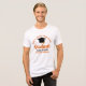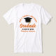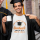 Estas modernas t-shirts de formando mais velho personalizado, com script laranja, apresentam o seu nome de segundo grau ou de universidade para a classe de 2025. Personalize com o seu ano de graduação com o script manuscrito chic e o boné formando preto para um excelente personalizado de festa de formatura para mais velho.