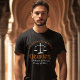 Esta camiseta de graduação da escola de direito negro personalizada apresenta tipografia laranja para uma classe de formando 2024. Personalize com seu ano de graduação, sob a escala de justiça, um excelente de advogado comemorativo personalizado para sua faculdade ou universidade.