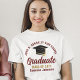 Estas modernas t-shirts de formando personalizadas de guião e dourado apresentam o seu nome de segundo grau ou de universidade para a classe de 2025. Personalize com o seu ano de graduação com o script manuscrito em chic e o boné de formando preto para um excelente personalizado de festa de formatura.