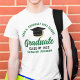 Estas modernas t-shirts de formando mais velho personalizadas com script verde apresentam o seu nome de segundo grau ou de universidade para a classe de 2025. Personalize com o seu ano de graduação com o script manuscrito em chic e o boné de formando preto para um excelente personalizado de festa de formatura.