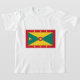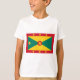 Bandeira de Granada. A bandeira nacional de Granada foi adotada após a independência do Reino Unido, em 7 de fevereiro de 1974. As seis estrelas na fronteira vermelha significam as seis paróquias do país, com a estrela central, cercada por um disco vermelho, em pé para a capital, a do Santo George. O símbolo no assento representa uma capa de noz-moscada, uma das principais culturas de Granada. Representa também uma ligação com o antigo nome de Granada, que era a "Ilha de Especiarias". A combinação de cores vermelho, ouro e verde, na bandeira é representativa da identidade africana do país. Vermelho significa coragem e vitalidade, amarelo para sabedoria e calor, e verde para vegetação e agricultura.